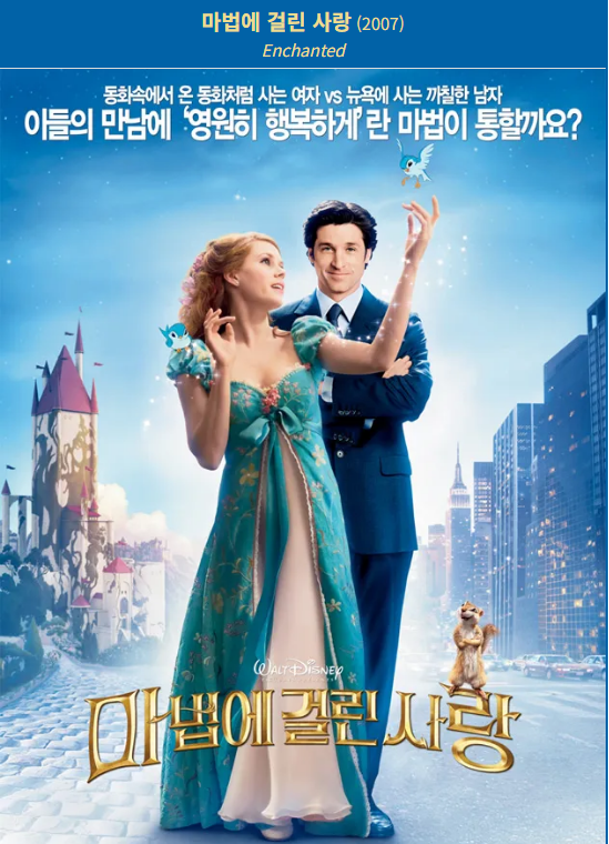 영화 마법에 걸린 사랑(Enchanted)은 디즈니가 전통적인 동화 속 세계와 현실 세계를 절묘하게 결합해 만든 독창적인 작품입니다. 애니메이션과 실사 영화를 넘나드는 방식으로 펼쳐지는 이야기는 관객에게 익숙하면서도 새로운 재미를 선사합니다. 단순히 동화적인 판타지를 보여주는 것이 아니라, 현실적인 사랑과 성장의 이야기를 담아 디즈니 영화의 색다른 매력을 보여준 작품입니다.